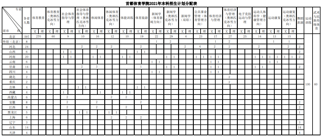 2021年首都体育学院招生计划已经公布,以下是北京市及全国各专业招生人数,这是填报志愿时非常重要的参考数据,供大家参考,如有变动,以学校官方公布为准: