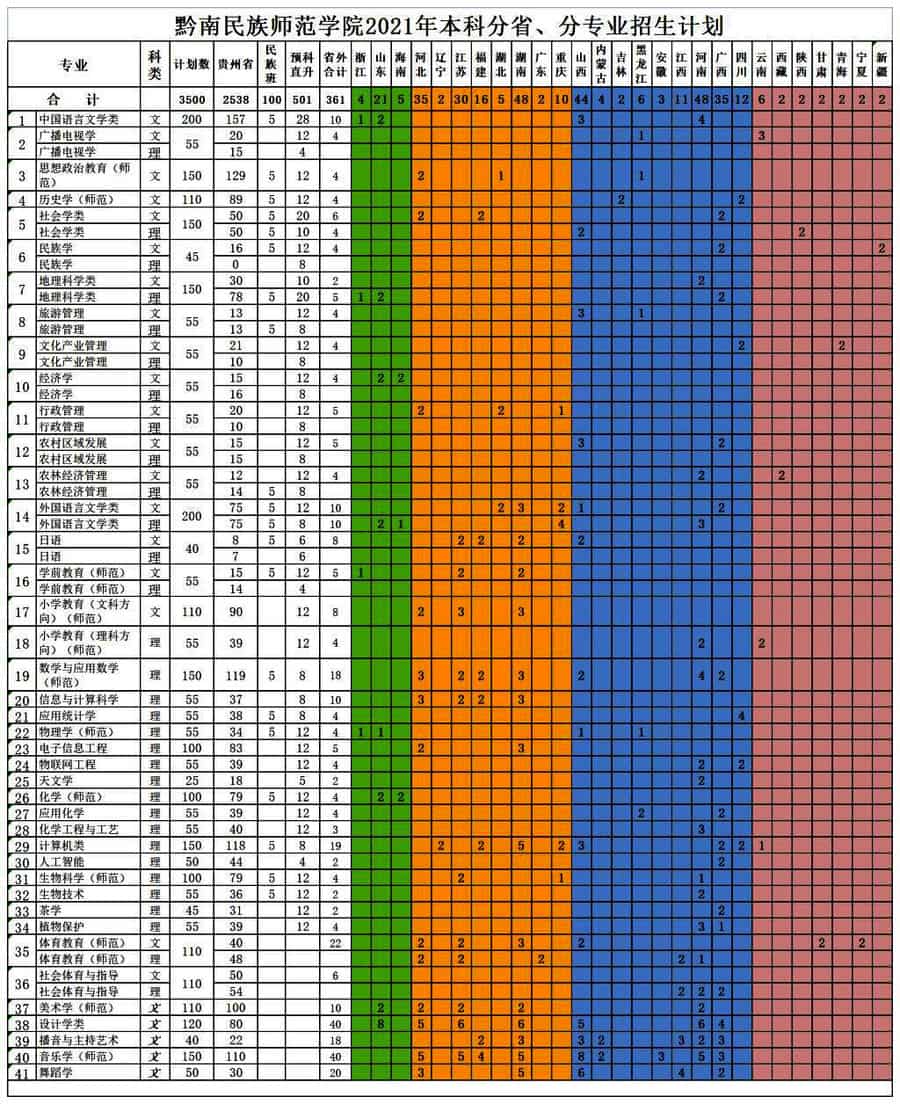 2021年黔南民族师范学院招生计划已经公布,以下是贵州省及全国各专业招生人数,这是填报志愿时非常重要的参考数据,供大家参考,如有变动,以学校官方公布为准: