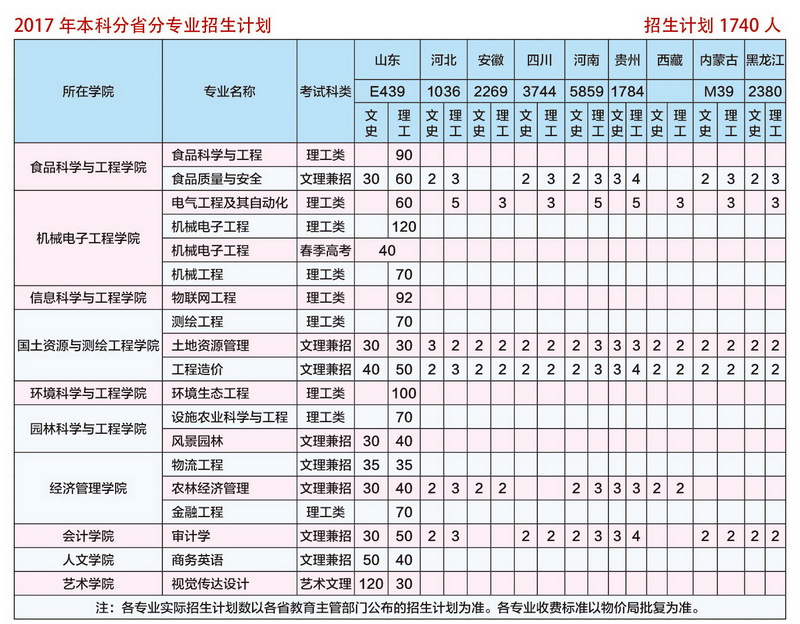 山东农业工程学院2017年本科招生计划