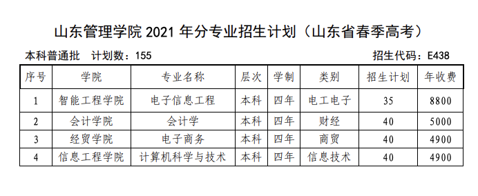 山东管理学院2021年分专业招生计划(山东省春季高考)