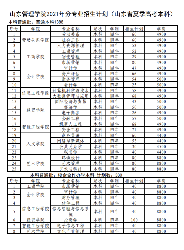 山东管理学院2021年分专业招生计划(山东省夏季高考本科)