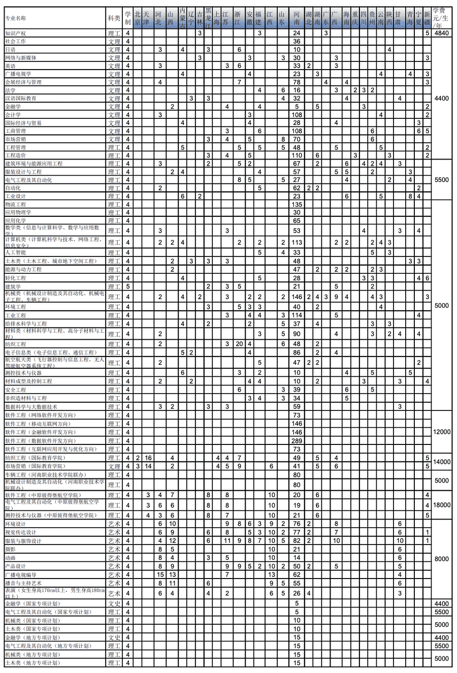 中原工学院2021年分省分专业招生计划