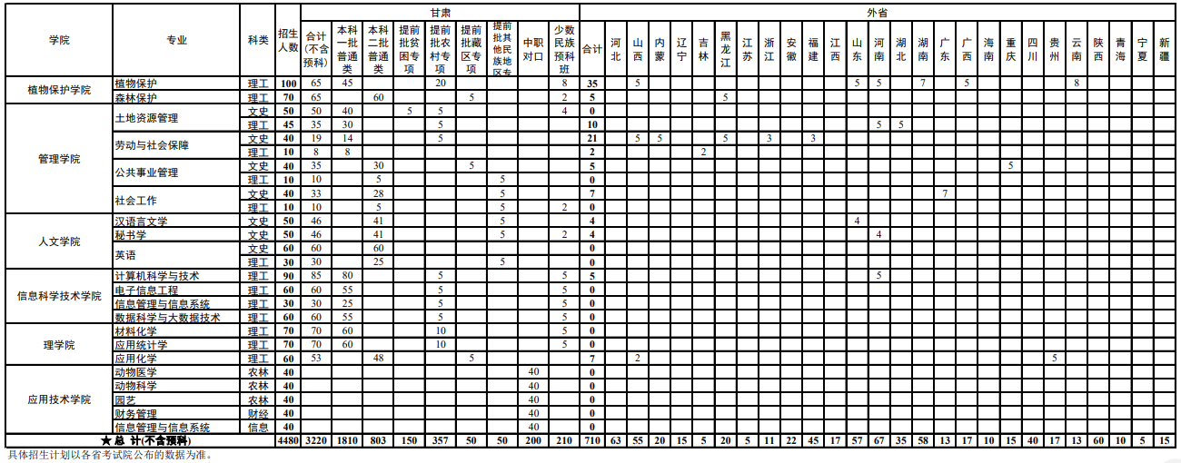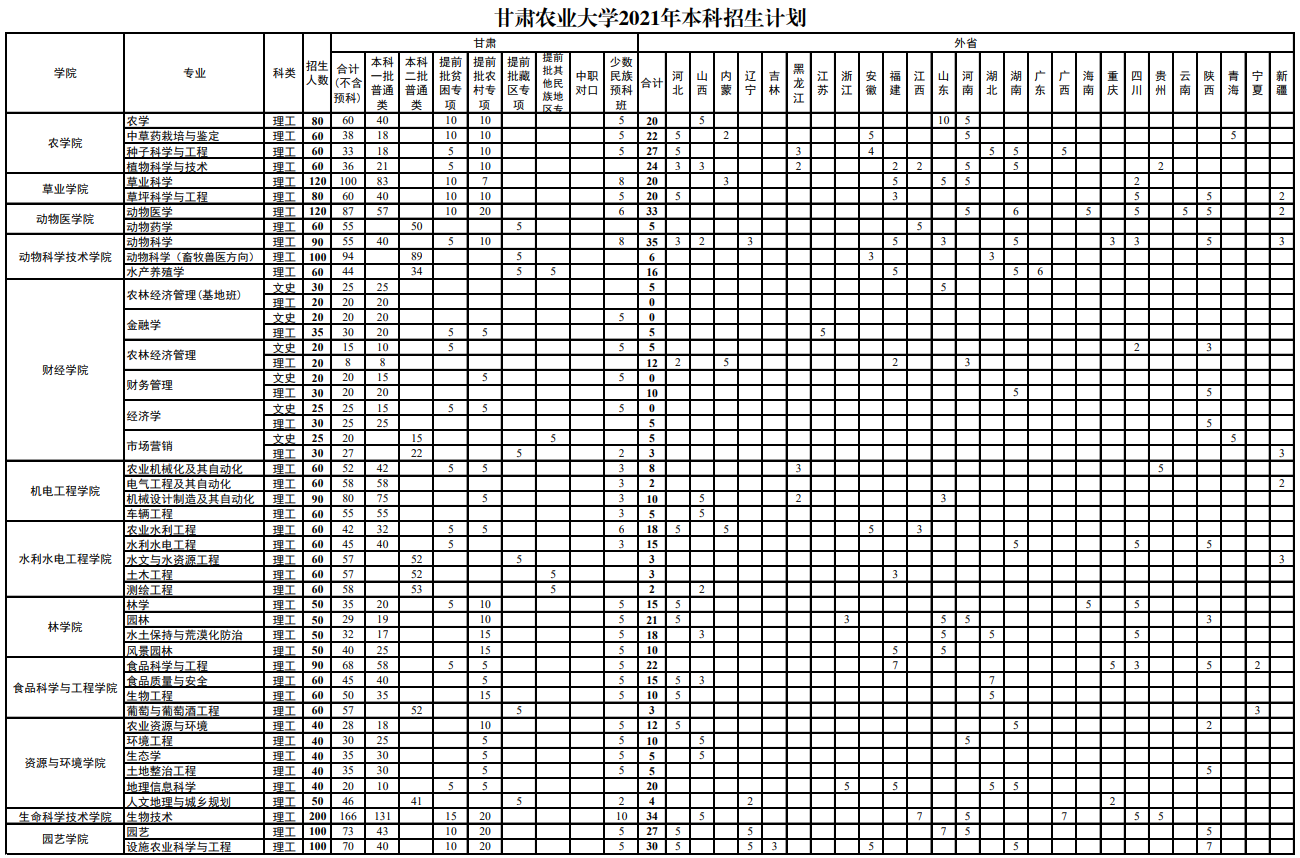 2021年甘肃农业大学招生计划已经公布,以下是甘肃省及全国各专业招生人数,这是填报志愿时非常重要的参考数据,供大家参考,如有变动,以学校官方公布为准: