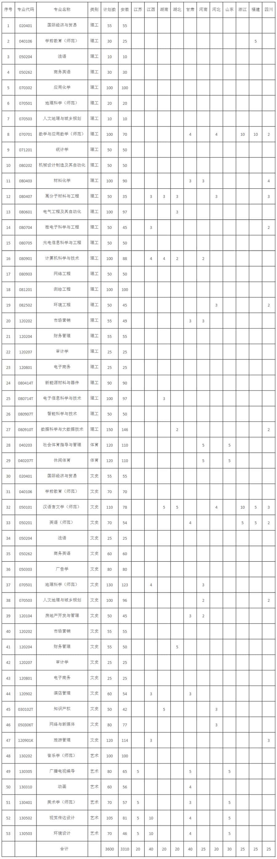 池州学院2021年普通招生分省专业招生计划
