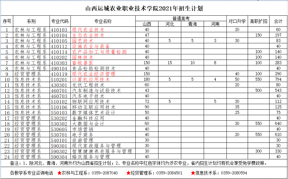 2021年山西运城农业职业技术学院招生计划已经公布,以下是山西省及全国各专业招生人数,这是填报志愿时非常重要的参考数据,供大家参考,如有变动,以学校官方公布为准: