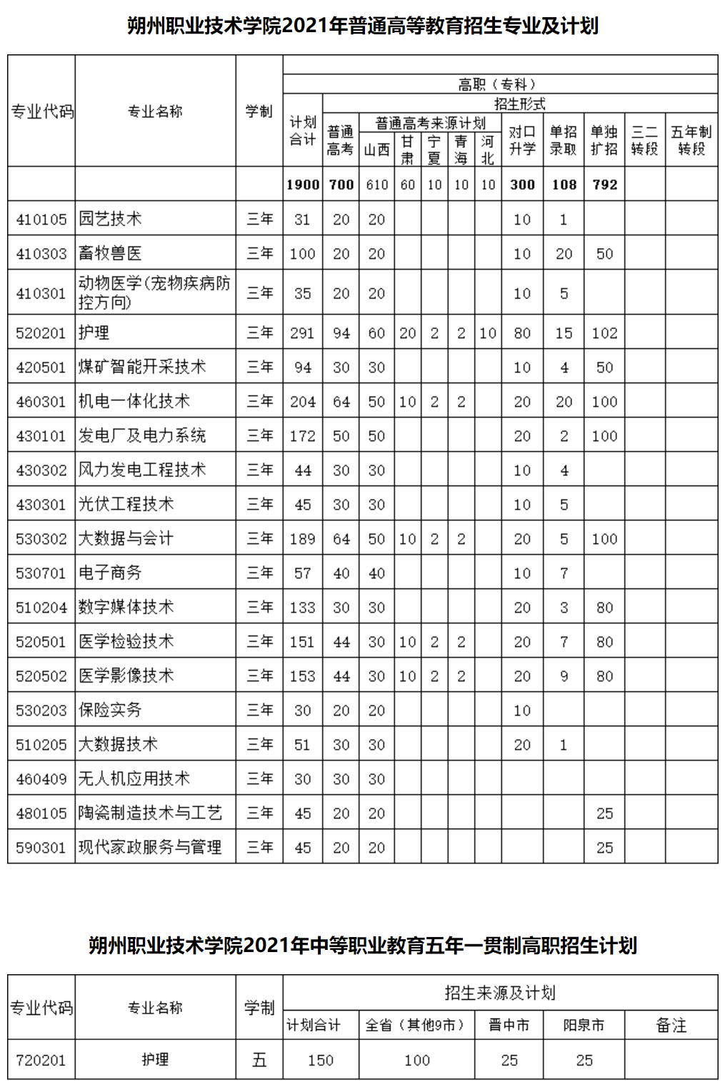 2021年朔州职业技术学院招生计划已经公布,以下是山西省及全国各专业招生人数,这是填报志愿时非常重要的参考数据,供大家参考,如有变动,以学校官方公布为准: