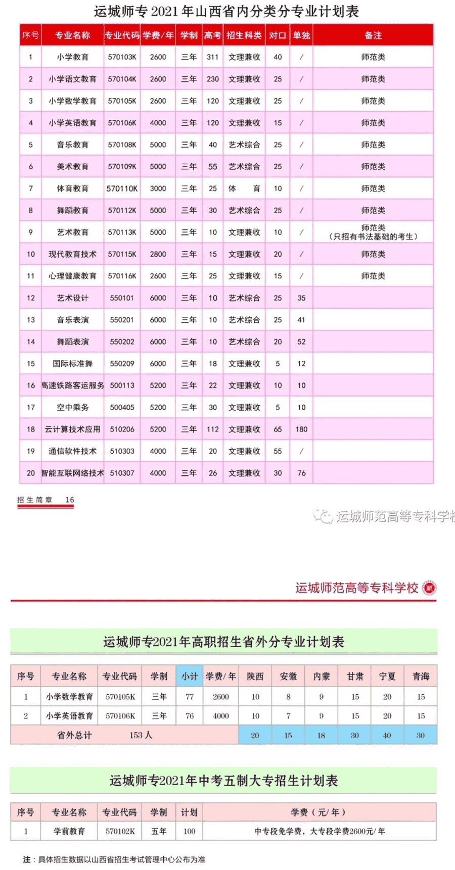 2021年运城师范高等专科学校招生计划已经公布,以下是山西省及全国各专业招生人数,这是填报志愿时非常重要的参考数据,供大家参考,如有变动,以学校官方公布为准: