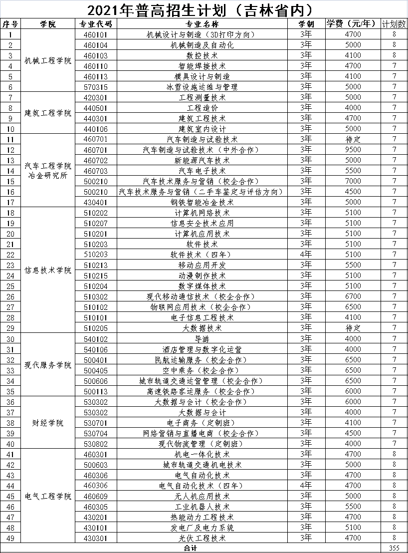 2021年吉林电子信息职业技术学院招生计划已经公布,以下是吉林省及全国各专业招生人数,这是填报志愿时非常重要的参考数据,供大家参考,如有变动,以学校官方公布为准: