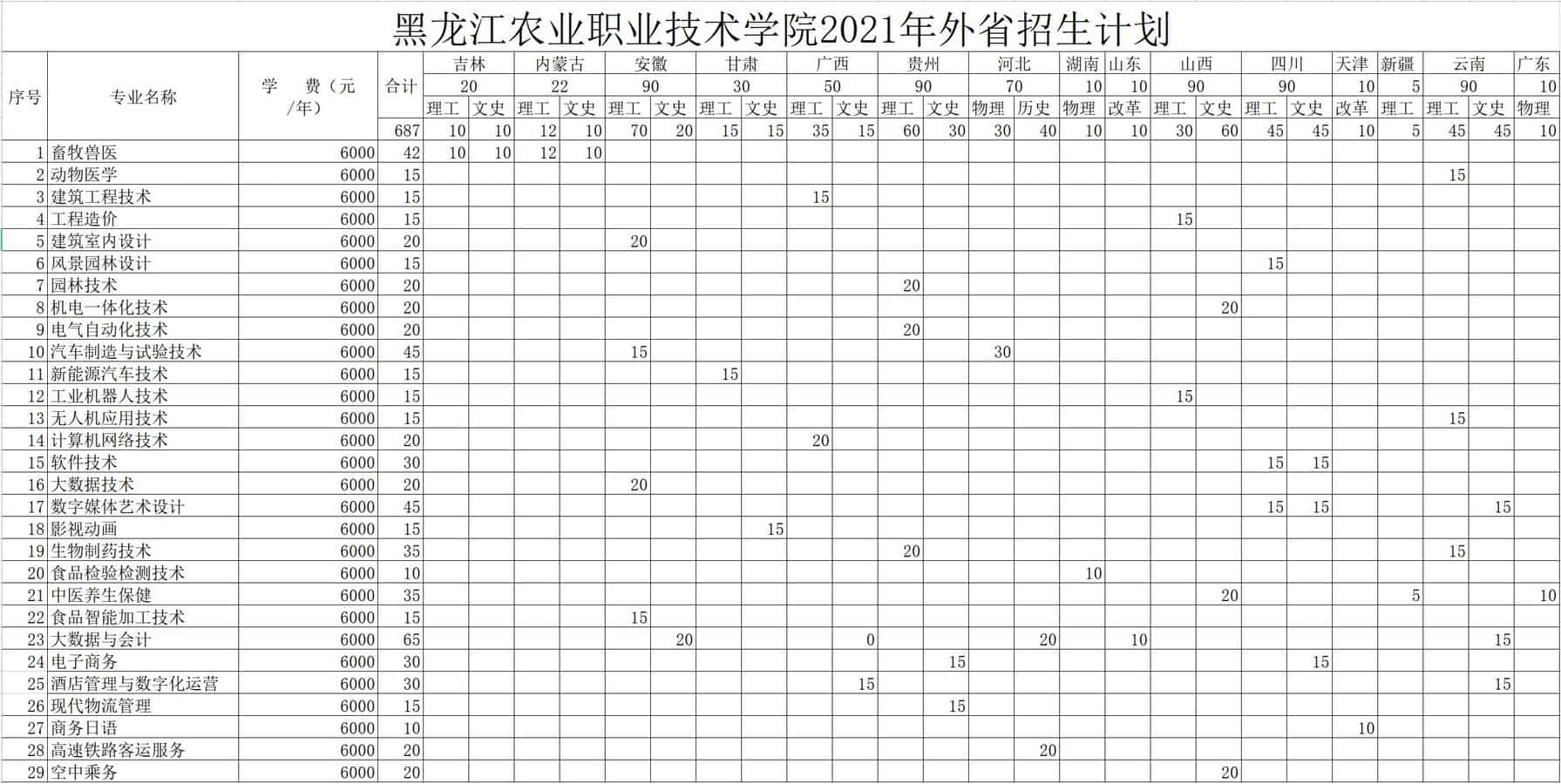 2021年黑龙江农业职业技术学院招生计划已经公布,以下是黑龙江省及全国各专业招生人数,这是填报志愿时非常重要的参考数据,供大家参考,如有变动,以学校官方公布为准: