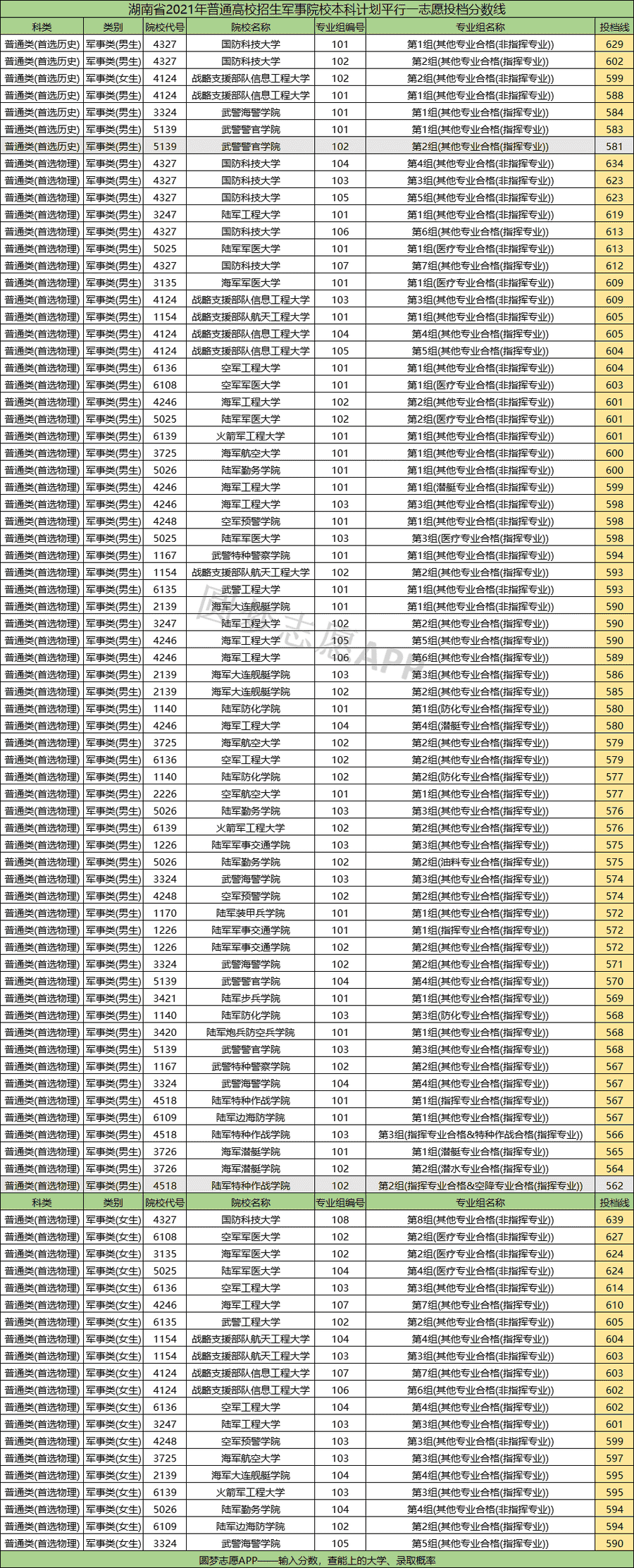 根据湖南省公布的2021年普通高校招生军校院校本科计划平行一志愿投档分数线: