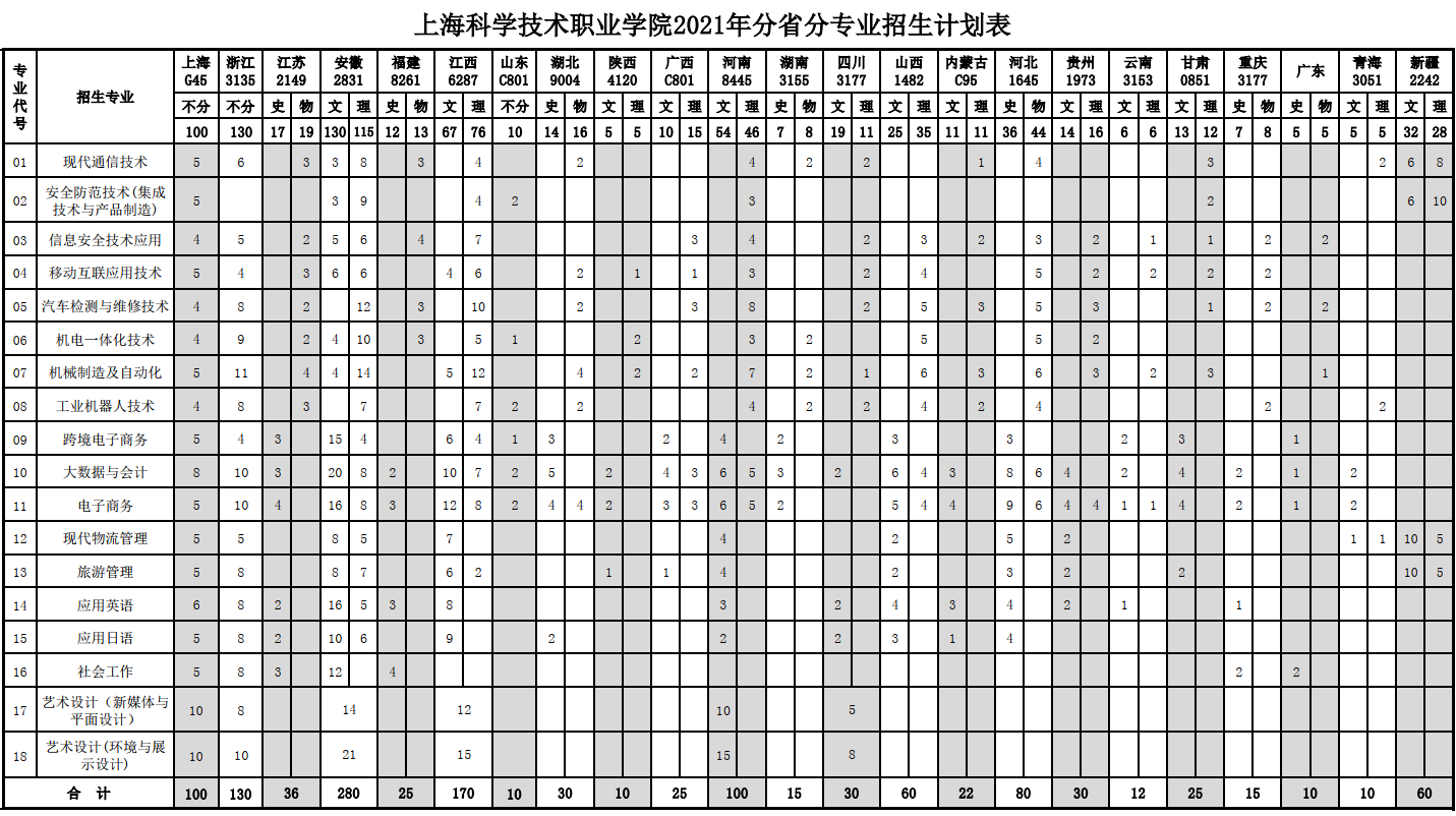 2021年上海科学技术职业学院招生计划已经公布,以下是上海市及全国各专业招生人数,这是填报志愿时非常重要的参考数据,供大家参考,如有变动,以学校官方公布为准: