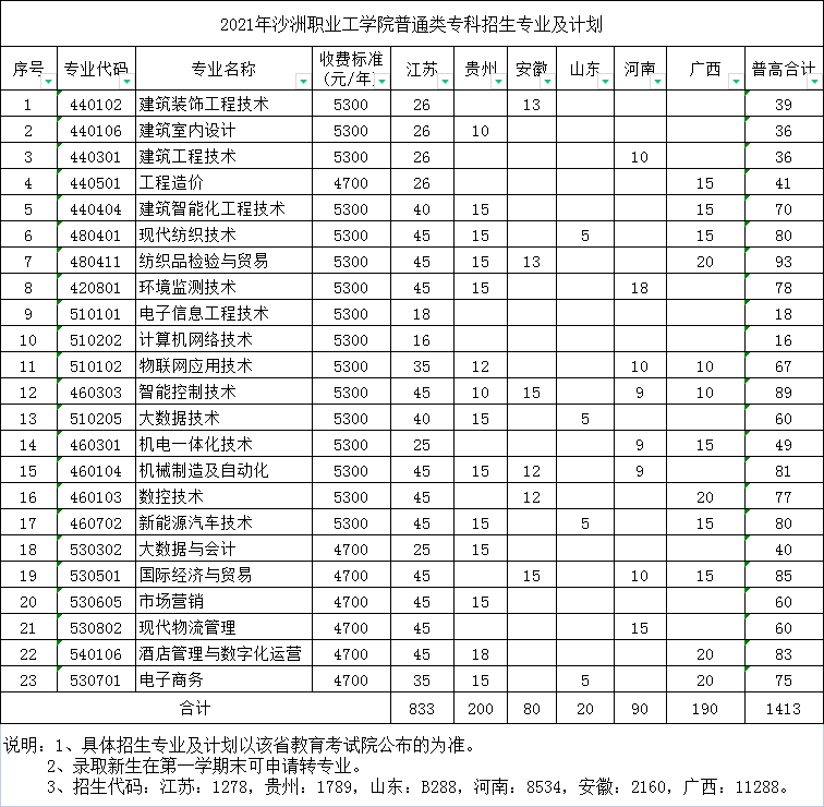 2021年沙洲职业工学院招生计划已经公布,以下是江苏省及全国各专业招生人数,这是填报志愿时非常重要的参考数据,供大家参考,如有变动,以学校官方公布为准: