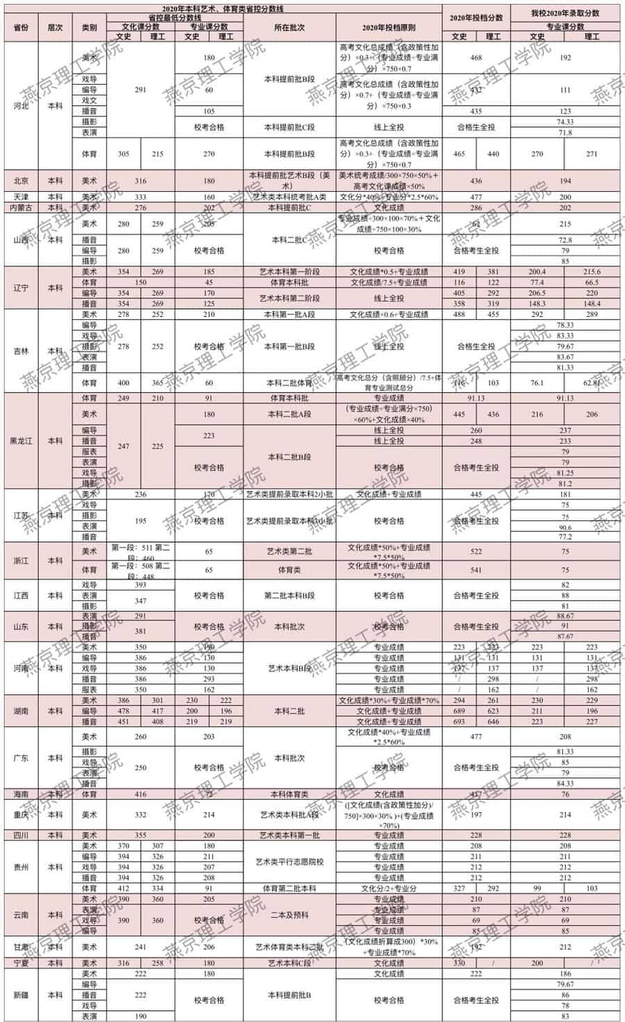 2020年燕京理工学院各省艺术、体育类录取分数线