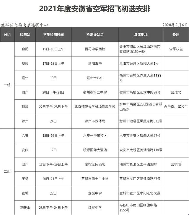 安徽省2021年空军招飞时间地点安排情况