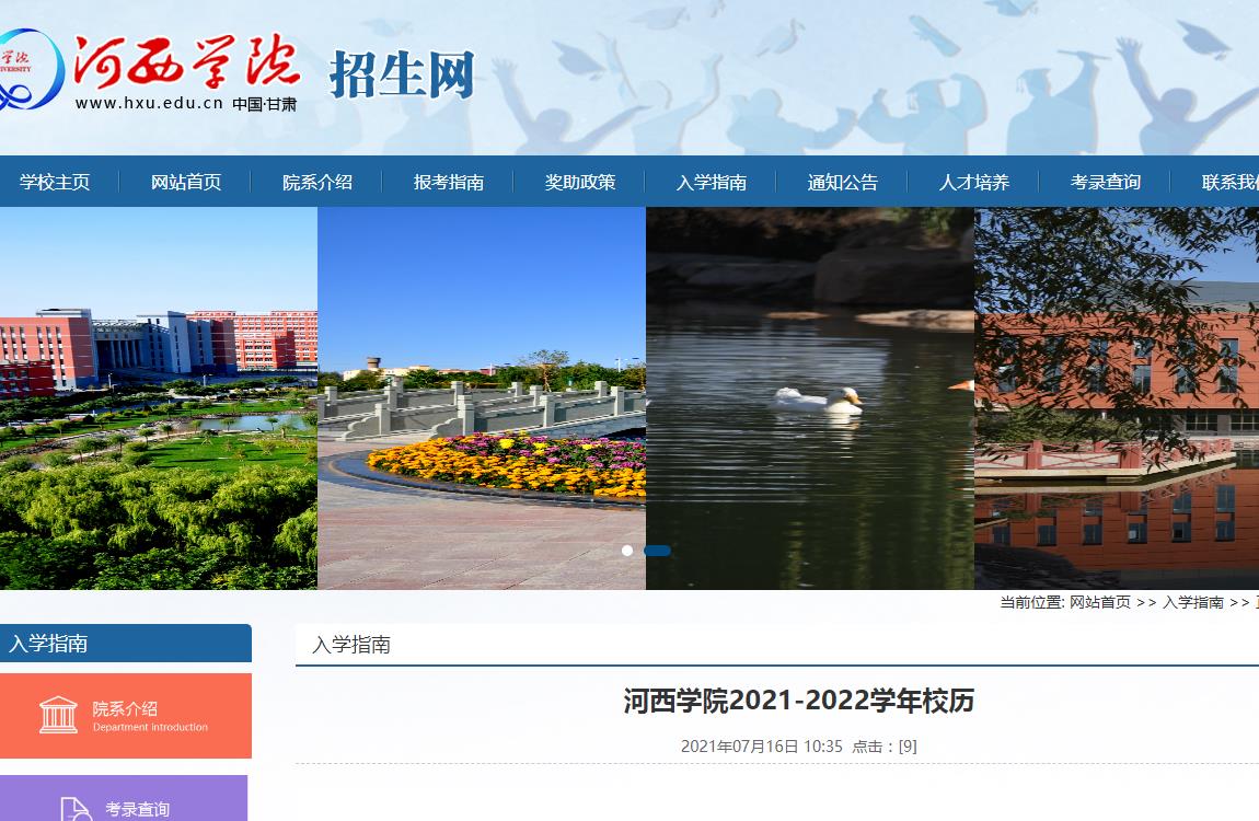 河西学院2021-2022学年校历 时间:2021-07-16 17:42 招生计划 文章来源(官网发布地址):http://zsw.hxu.edu.cn/info/1155/1403.htm官网发布缓存图(部分):