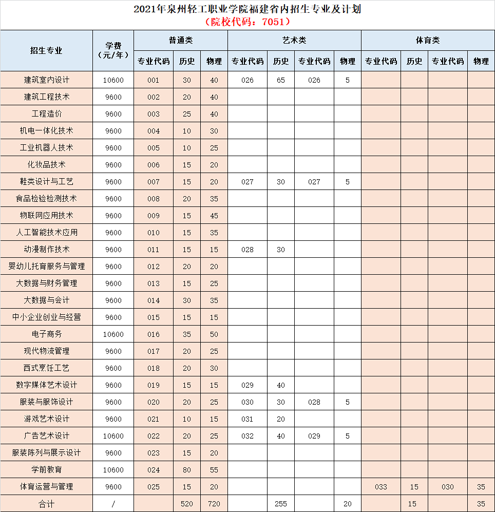 2021年泉州轻工职业学院招生计划已经公布,以下是福建省各专业招生人数,这是填报志愿时非常重要的参考数据,供大家参考,如有变动,以学校官方公布为准: