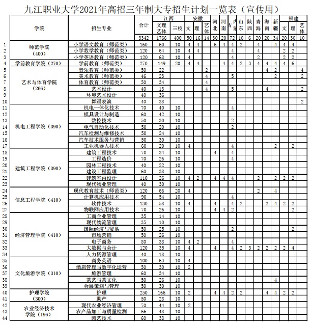 2021年九江职业大学招生计划已经公布,以下是江西省及全国各专业招生人数,这是填报志愿时非常重要的参考数据,供大家参考,如有变动,以学校官方公布为准: