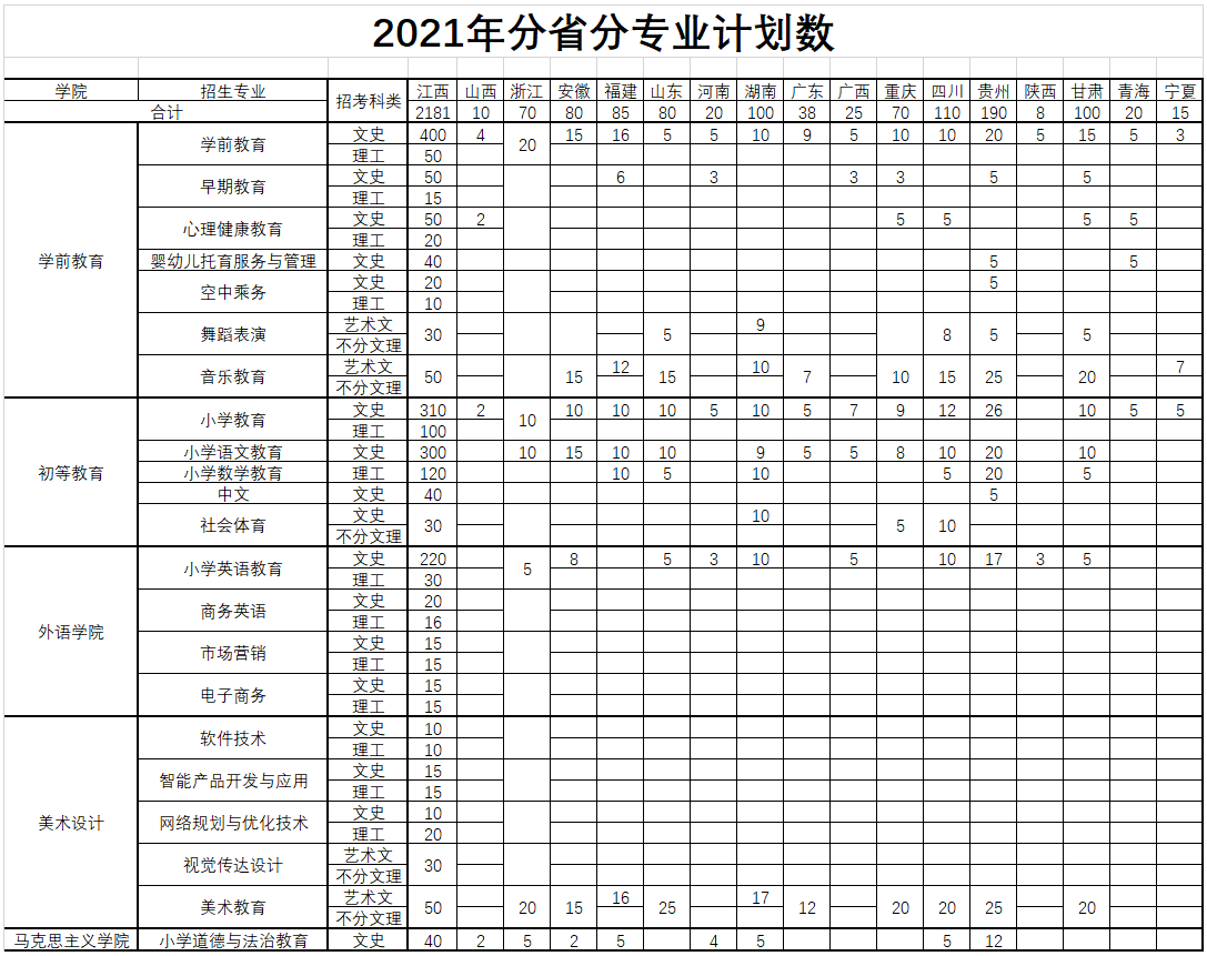 2021年宜春幼儿师范高等专科学校招生计划已经公布,以下是江西省及全国各专业招生人数,这是填报志愿时非常重要的参考数据,供大家参考,如有变动,以学校官方公布为准: