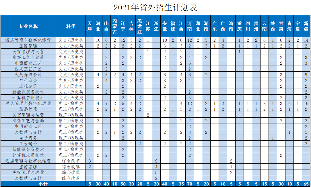 2021年青岛酒店管理职业技术学院招生计划已经公布,以下是山东省及全国各专业招生人数,这是填报志愿时非常重要的参考数据,供大家参考,如有变动,以学校官方公布为准: