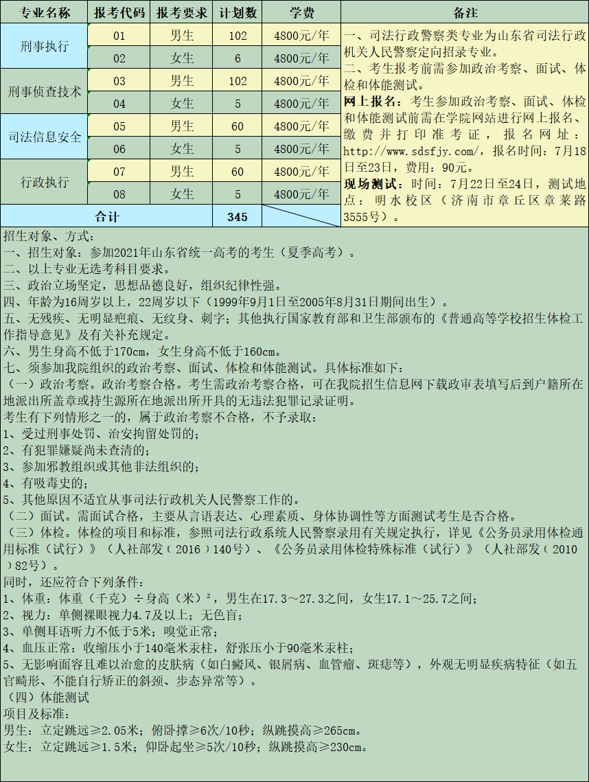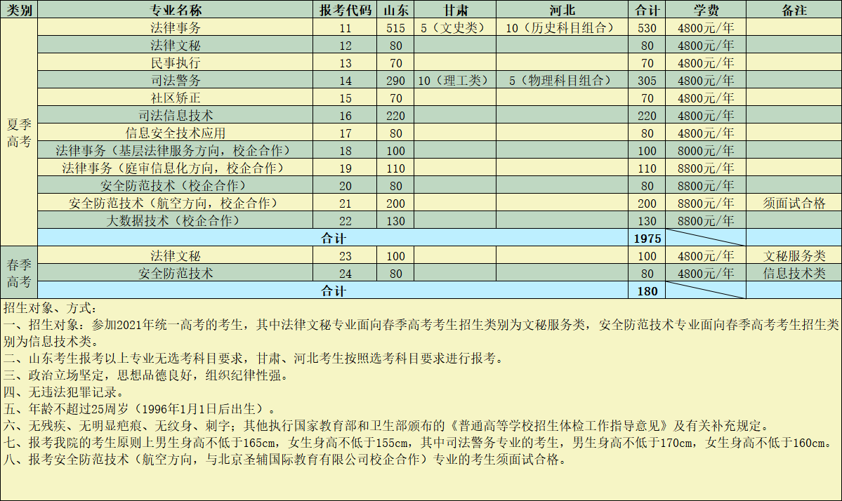 2021年山东司法警官职业学院招生计划已经公布,以下是山东省及全国各专业招生人数,这是填报志愿时非常重要的参考数据,供大家参考,如有变动,以学校官方公布为准: