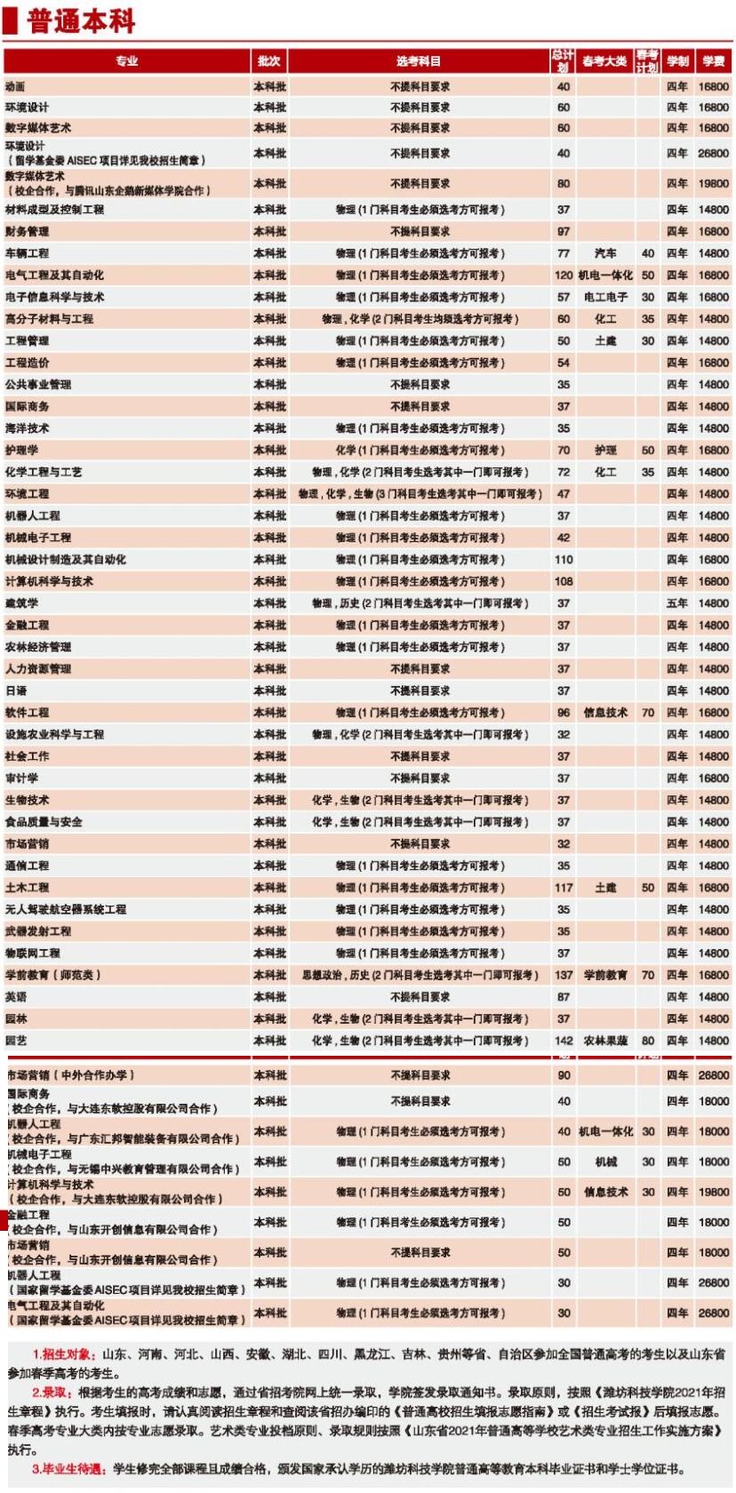 潍坊科技学院学费本科:14800-16800元/年,校企合作专业:18000-19800元/年,数字媒体艺术专业(AISEC项目)19800元/年,市场营销专业(中外合作)、环境设计专业、机器人工程专业、电气工程及其自动化专业:26800元/年。