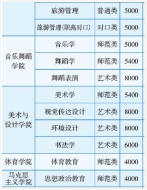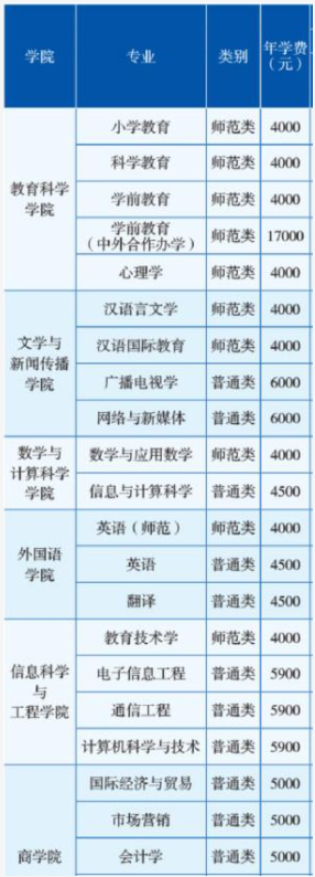 普通类专业学费为4000-6000元/年;师范类专业学费基本上为4000元/年;中外合作办学类专业学费为17000元/年;艺术类专业学费为5400-8000元/年;体育类专业学费为4000元/年。