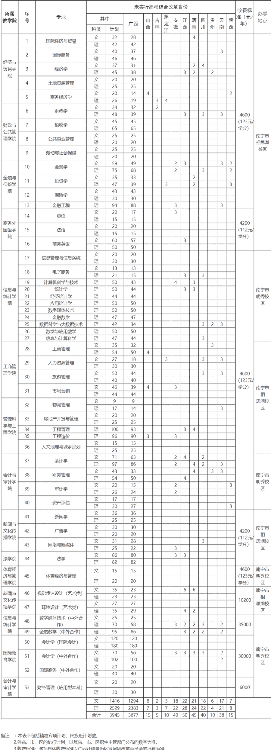 | 经济与贸易学院 | 1 | 国际经济与贸易 | 7 | 3 | 4 | 4600(123元/学分) | 南宁市相思湖校区 | 本科第二批 | 41548 |