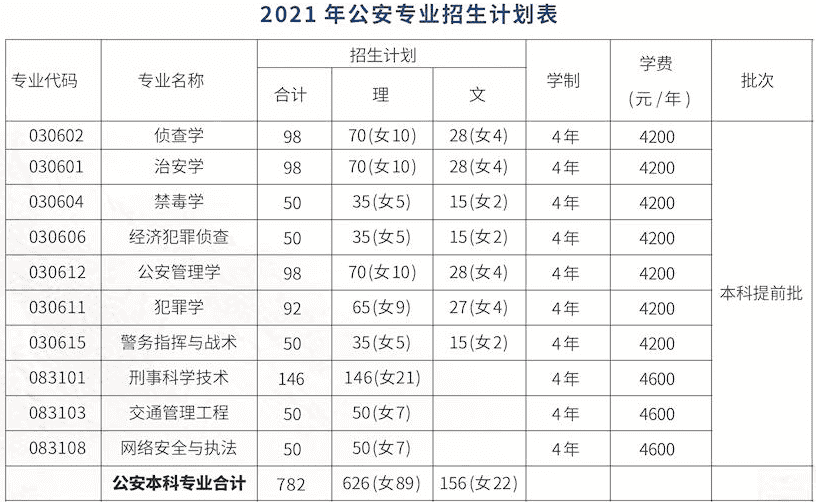 学科专业以法学为基础,公安学、公安技术为主体,相关专业为支撑。现有治安学、侦查学等10个公安本科专业,法学、监狱学等8个普通本科专业;有法律事务、民航安全技术管理等15个高职高专专业。