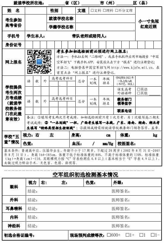 2022空军招飞初选参检表 什么时间报名