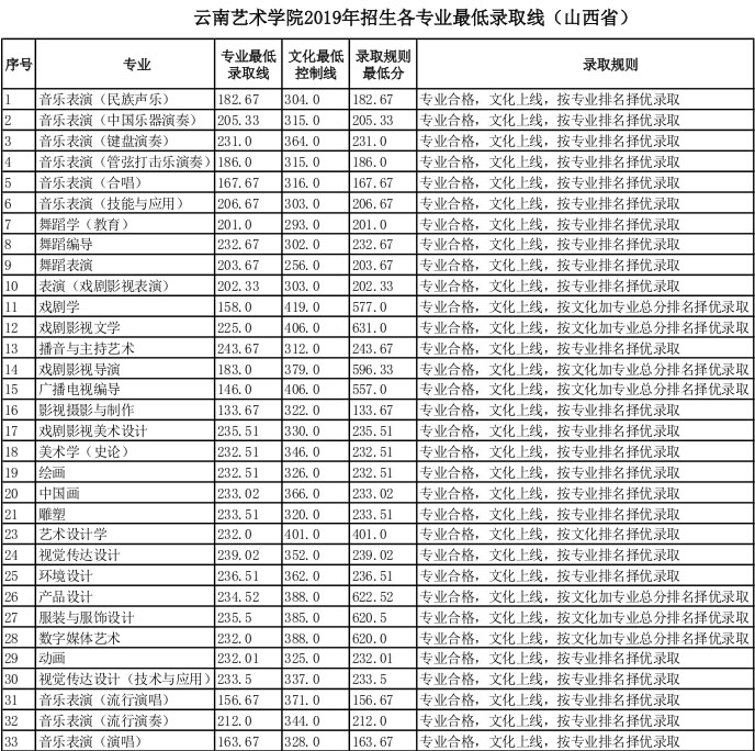 云南艺术学院2019年山西省艺术类专业录取分数线