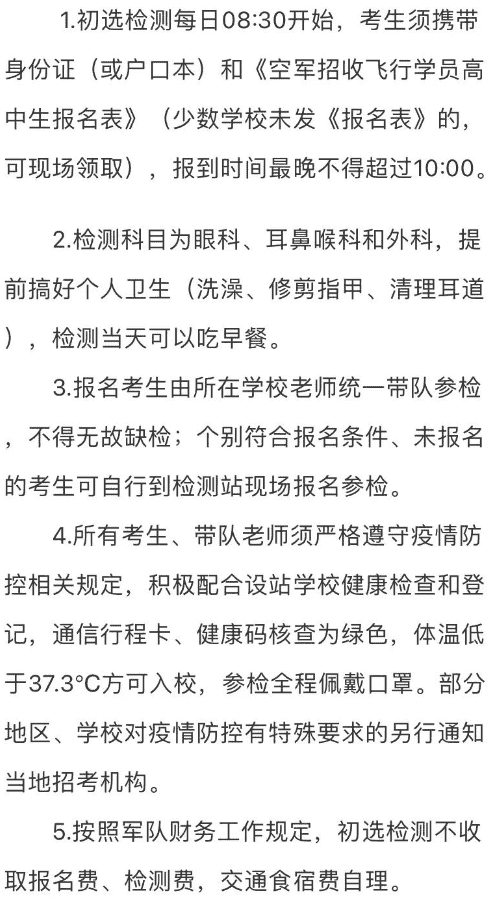 根据2022年度空军招飞工作安排,2021年10月10日至20日,空军招飞局成都选拔中心将派初选检测组赴相关市(州),对报考空军飞行学员的学生进行检测。