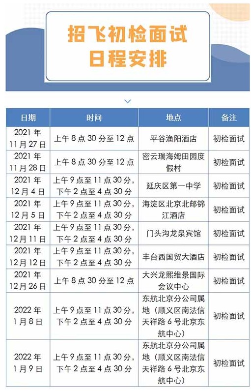 即日起至2022年3月10日17时前,符合条件考生可在东航招聘网站进行预约报名。如若错过上述初检面试的所有安排,北京分公司会通过短信形式择期再行组织初检面试。