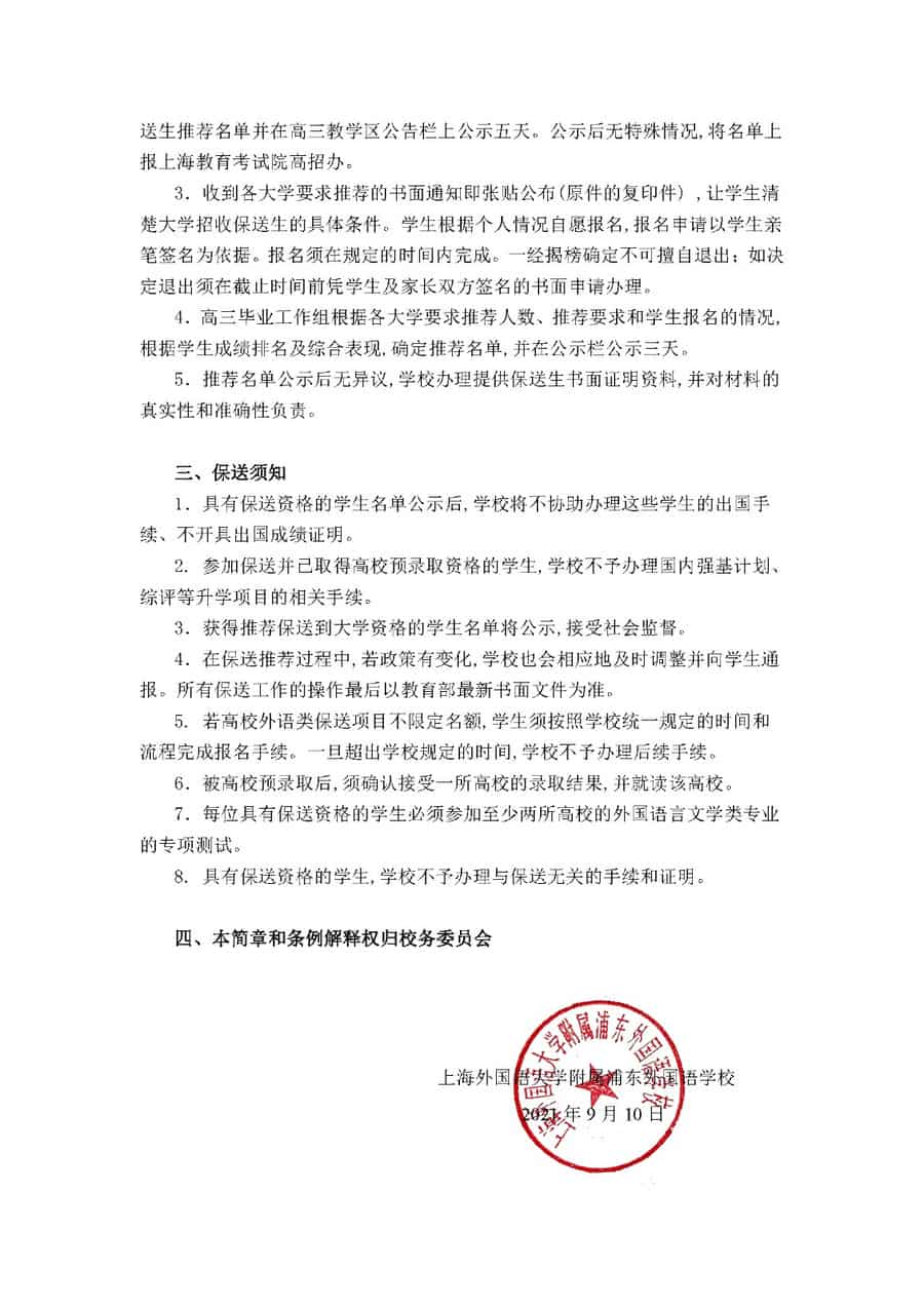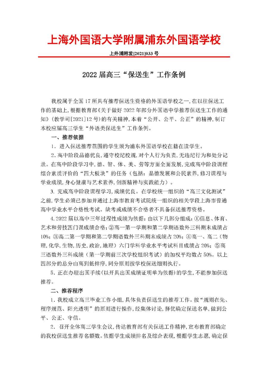 根据教育部高校学生司《关于做好2022年部分外国语中学推荐保送生工作的通知》(教学司〔2021〕12号)要求,上海外国语大学附属浦东外国语学校公布了2022届高三“保送生”工作条例,具体内容整理如下,供各位考生朋友查阅了解,赶快来看吧!