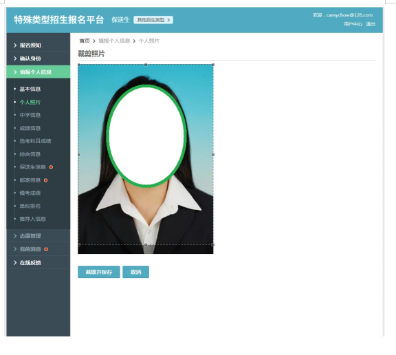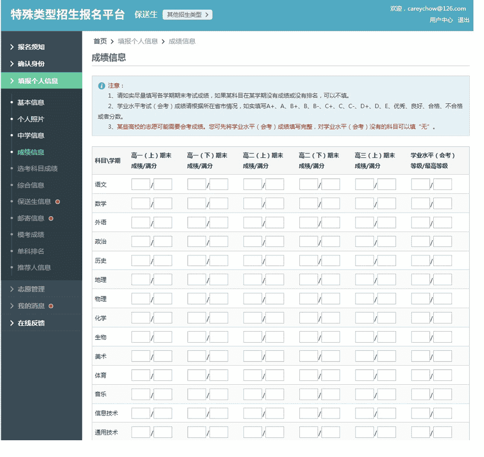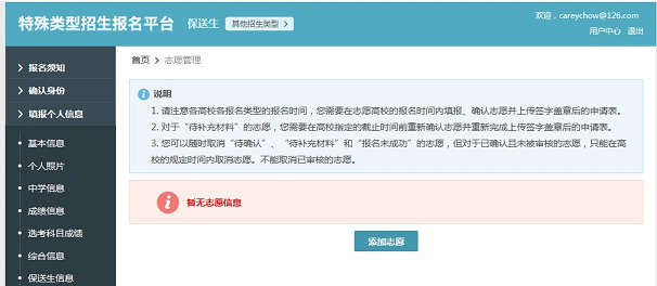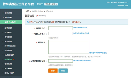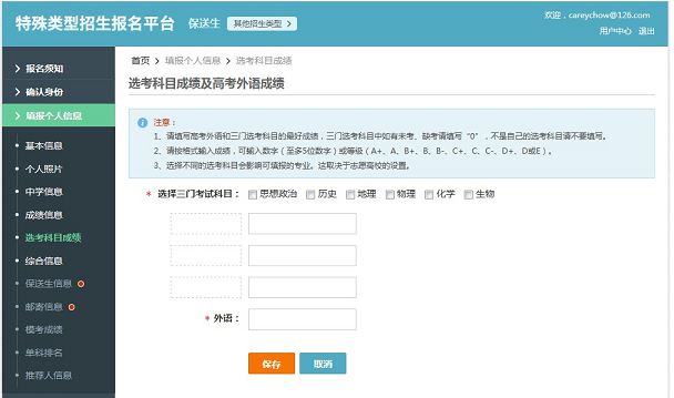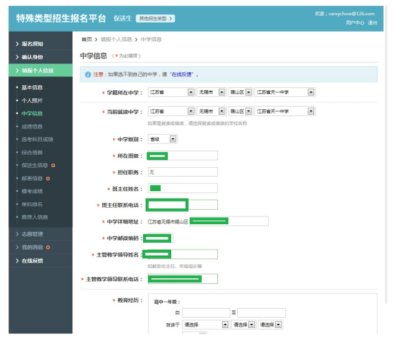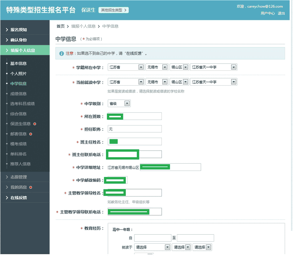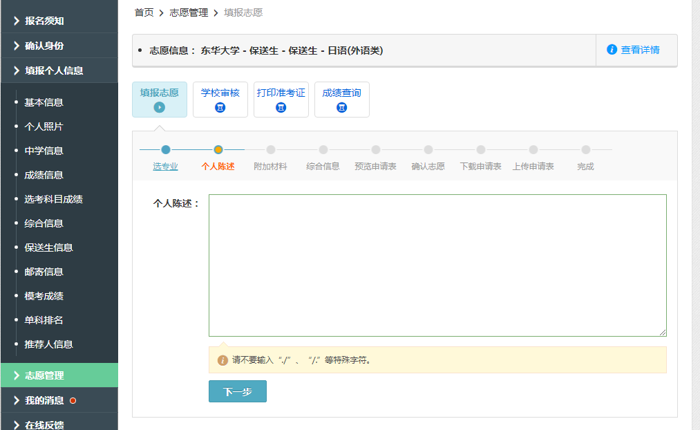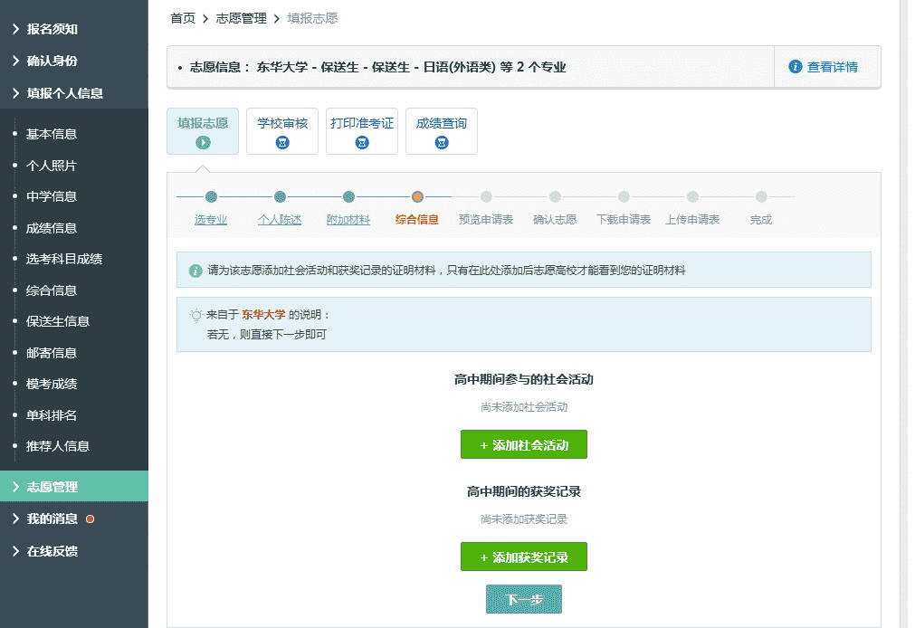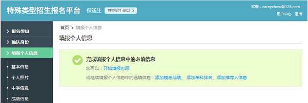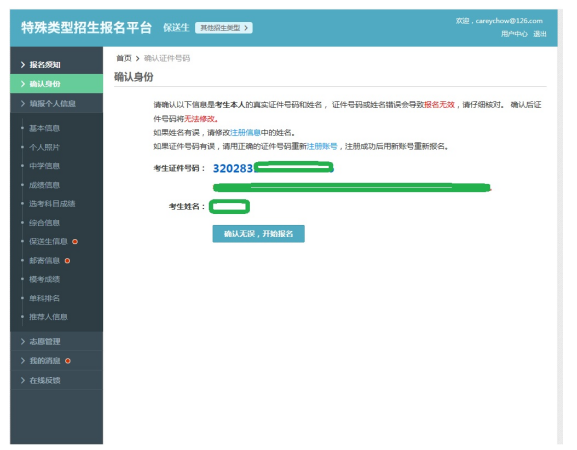 将左侧栏中的确认身份、个人信息填写完整(基本信息、个人照片、中学信息、成绩信息、选考科目信息(上海、浙江、北京、天津、山东、海南、河北、辽宁、江苏、湖南、湖北、广东、重庆和福建的生源学生须填写此栏目)、综合信息、保送生信息、邮寄信息、模考成绩、单科排名等)。