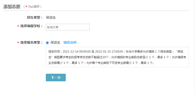 想要报考2022年高考特殊类型招生保送生的考生,需要在院校规定的报名时间内登录“阳光高考特殊类型招生报名平台”,按照流程要求进行填报,考生可于2022年1月13日后在阳光高考报名平台查询审核结果,初审合格者可于2022年1月17日起在阳光高考平台自行下载并打印准考证。