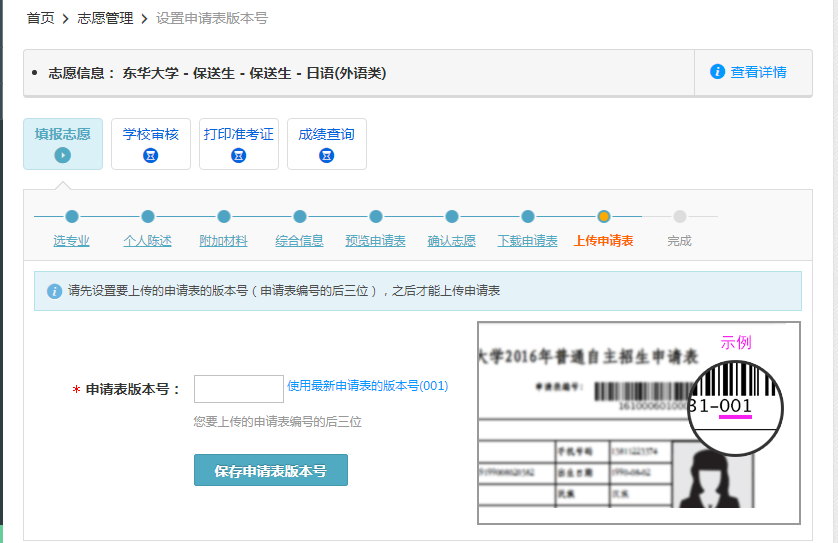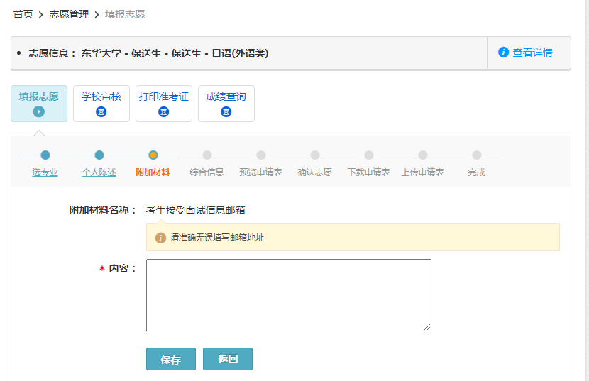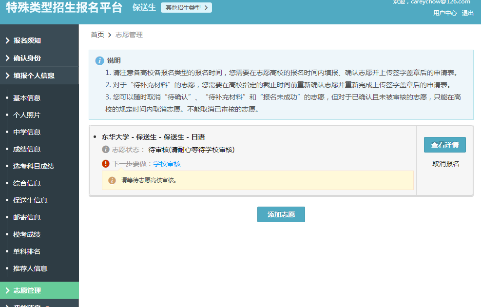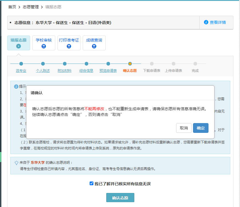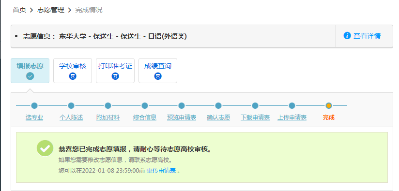 重要的操作提醒:进入到志愿管理后,可点击东华大学这条志愿后边的查看详情,即可查看各个阶段的时间节点和操作。