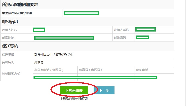 确认志愿结束后,在申请表显示界面最下方可以下载打印,前往就读外国语中学盖章。