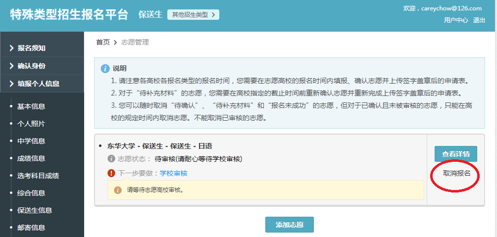 如果有些信息发现填报错误需要修改,可以取消报名后重新填写。