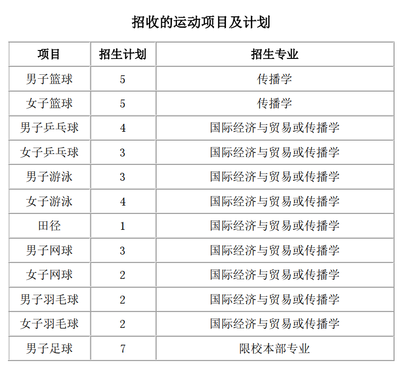 羽毛球:一级及以上运动员考生,且在高中阶段获省级中学生比赛单打前两名,或全国中学生羽毛球比赛分站赛单打前两名或总决赛单打前四名;不接受15岁(含,以出生年月日为准)以后在国家体育总局或中国羽毛球协会注册过的运动员、有国际羽联排名的运动员以及在入学前代表省、自治区、直辖市、特别行政区、市、俱乐部、行业体协、企业或以个人身份参加(报名)下列比赛之一的运动员报名: