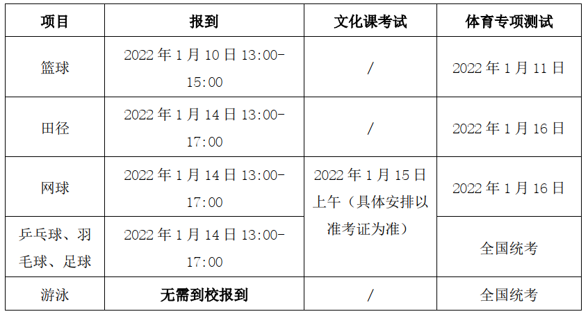 报考乒乓球、羽毛球、网球、足球项目的考生须参加我校组织的文化课考试,考试拟于2022年1月15日上午在上海交通大学举行,科目为语文、数学、英语,时间为3小时。将根据报考体育项目及报考类别分别确定文化课考试达标线,文化课考试不达标者不予参加体育专项测试的资格(乒乓球、羽毛球、足球项目为报考我校资格,测试费不退)。