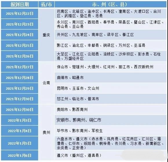 根据2022年度空军招飞工作安排,空军招飞局成都选拔中心计划从12月22日开始,组织重庆、云南、贵州部分初选合格考生复选检测(四川省复选检测通知于元旦节后发布)。接到当地招考部门、学校通知参加复选检测的考生,于报到当日上午10:00至11:30报到,超过11:30不再组织报到,报到后即统一安排核酸检测。