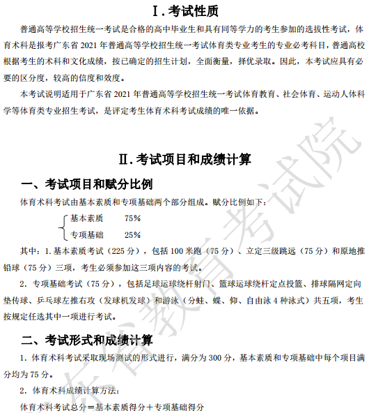 广东省2021年普通高等学校招生统一考试体育术科考试说明发布,包括考试项目和成绩计算、考试方法和评分标准等,具体如下:
