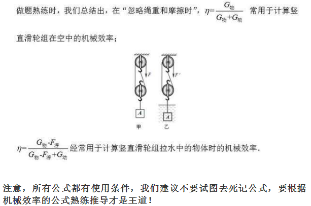 或η=W有用/W总=Gh/Fs=Gh/Fnh=G/nF=(不计绳重及摩擦)G/(G+G动)