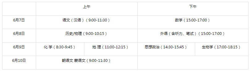 语文、数学、外语考试时间安排在6月7日全天和6月8日下午,其中语文考试时间为150分钟,数学、外语(含听力和笔试)考试时间均为120分钟。思想政治、历史、地理、物理、化学、生物学时间安排在6月8日上午和6月9日全天,每科考试时间为75分钟。朝语文、蒙语文安排在6月10日上午,考试时间为150分钟。