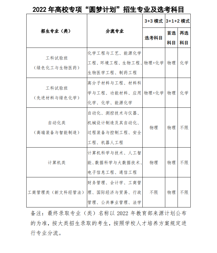 2022年北京化工大学圆梦计划招生专业计划