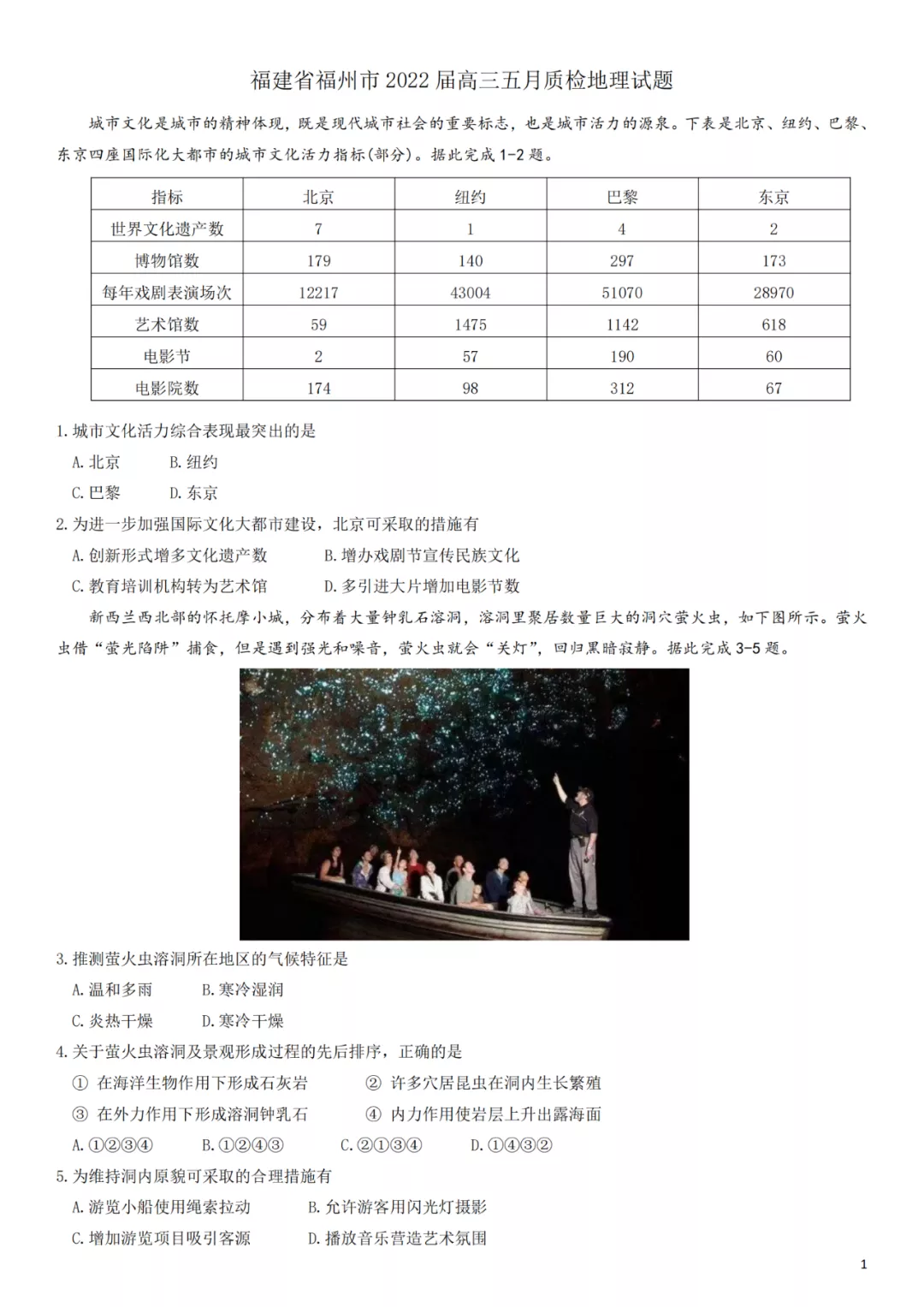 福建省福州市2022届高三年五月份质量检测地理试题及答案