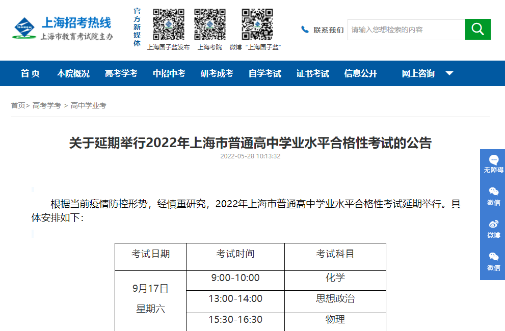 关于延期举行2022年上海市普通高中学业水平合格性考试的公告