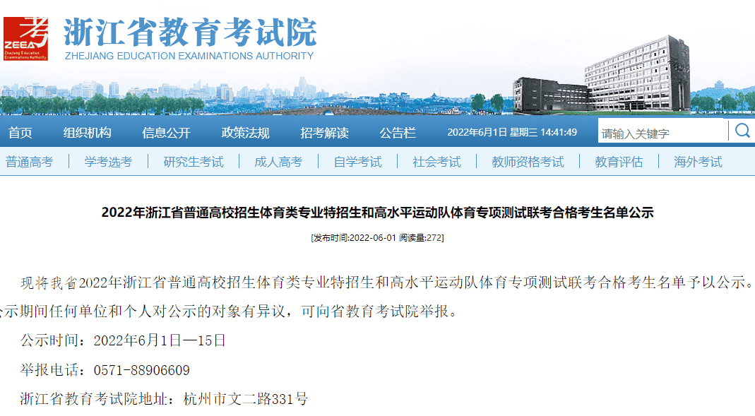 现将我省2022年浙江省普通高校招生体育类专业特招生和高水平运动队体育专项测试联考合格考生名单予以公示。公示期间任何单位和个人对公示的对象有异议,可向省教育考试院举报。