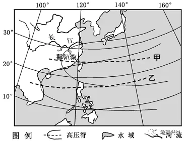 6.鄱阳湖补给长江频率较高的时期,副热带高压脊的位置及发生的天气现象分别是()