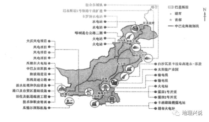 (1)根据图中信息,中巴经济走廊布局了许多火电站,太阳能电站,风电站,水电站等项目,这此项目主要是由中方援建,一方面说明巴基斯坦电力短缺,另一方面说明巴基斯坦科技水平较低,无法依靠自身的力量完成这些项目的建设。